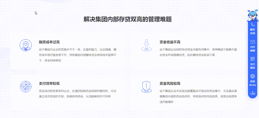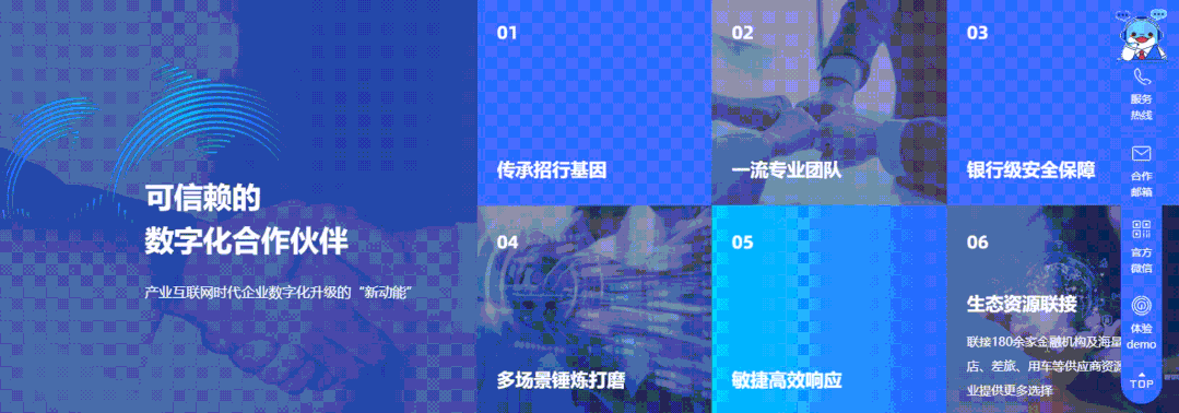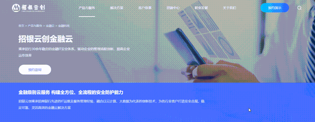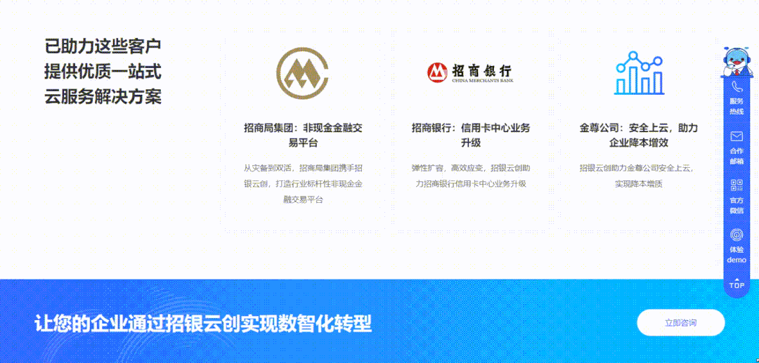 对于ToB品牌网站,动效的交互体验需要符合整体的品牌形象,既要提升网站的体验度,又不能打扰访客的正常浏览;招银云创网站结合品牌VI视觉元素和信息内容展示相结合,品牌形象、交互体验我们都要,一个都不能少。