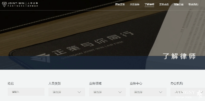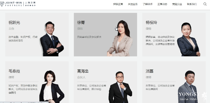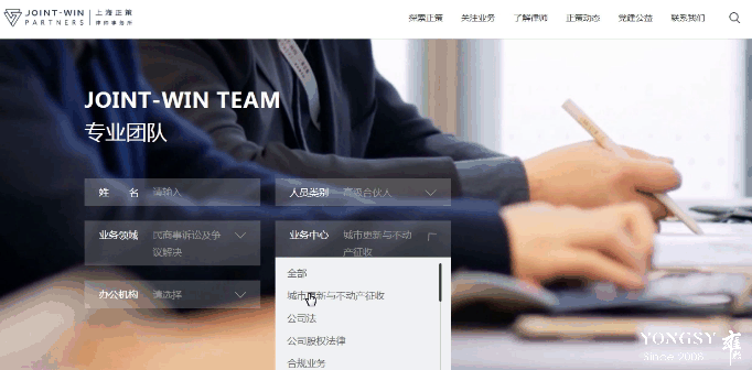 结合数据分析得知用户上正策官网往往会寻找相关对应律师,故在首页专业团队这张KV图上,增加了不同的筛选条件,从姓名到类型、领域等等,从不同维度提升用户体验。