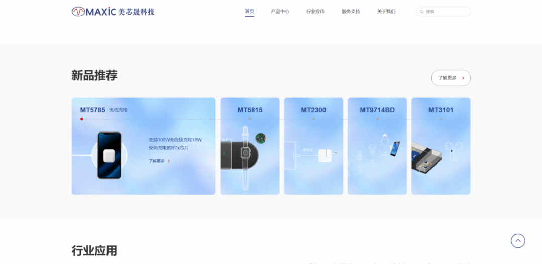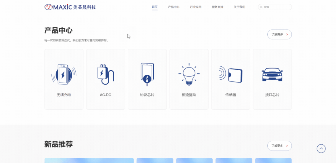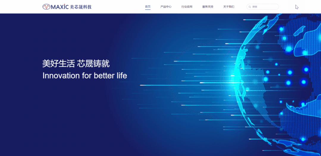 网站主色调采用VI色,在沿用主色调的基础上,用白色留底,整体布局简约现代,视觉观感舒服自然,网站采用左右留白处理手法,让用户聚焦核心内容,降低页面的紧奏性,提升页面的呼吸感;逻辑上我们根据美芯晟主要的受众规划,重点突出产品-应用-品牌,对产品-应用设置闭环管理,提升页面的友好性,降低网站的跳出率。